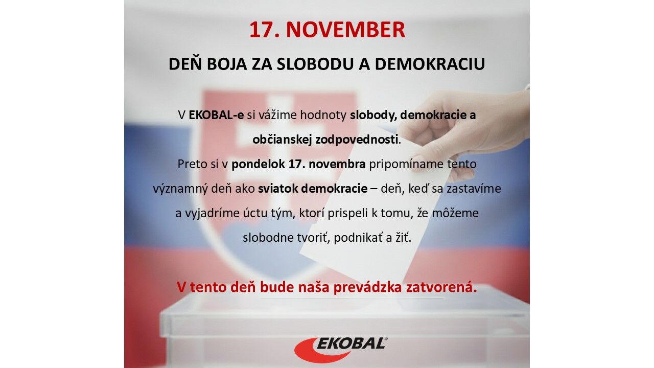 Vážení obchodní partneri, z dôvodu spomienky na Deň boja za slobodu a demokraciu bude prevádzka spoločnosti EKOBAL v pondelok 17. novembra 2025 zatvorená.