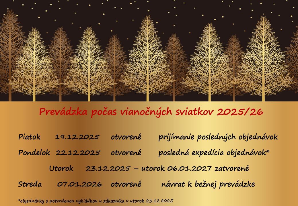 | Pondelok | 22.12.2025 | Otvorené | Expedovanie posledných objednávok pred Vianocami 2025. |