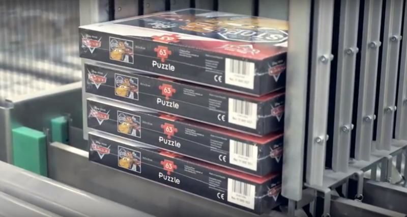 Na výrobní linku produkující jednotlivé krabičky her navazuje výkonný paletizátor, ojedinělý množstvím paletizačních schémat – v současné době skládá krabičky na paletě podle 36 vzorců. Uživatelsky přívětivý ovládací panel navíc umožňuje zaškoleným operátorům úpravu schématu bez nutnosti práce programátora (výrobce stroje). Paletizací projede až 1800 krabiček za hodinu, řídicí systém paletizátoru si navíc sám určuje, po kolika jsou na sobě hry seřazeny v předcházejícím zařízení „štosovačka. Taková porce zábavy si vyžaduje i výkonný balicí stroj na palety, a proto jsme zde integrovali balicí stroj Rotomatic Profi. Lehké nestabilní krabičky a velká variabilita skladeb palet potřebují i perfektní výbavu stroje. Balicí stroj je doplněn o zdvih palet, přítlak pro přidržení zboží na paletě, překrývací zařízení na položení horní krycí fólie a zejména dvou motorové digitálně řízené předepínání fólie s ropingem, t.j shrnutím spodní hrany fólie do provázku.